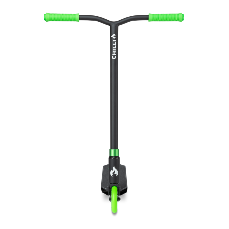 De Chilli Base black-green stuntstep is het perfecte instap model voor kinderen vanaf ongeveer 8 jaar. De zeer betaalbare Chilli Base black-green stuntstep is opgebouwd uit onderdelen van hoge kwaliteit voor een onverslaanbare prijs. Het 50cm lange en 11,5 cm brede dek ziet er niet alleen heel mooi uit maar zorgt ook voor voldoende ruimte om stevig te staan. Het HIC compression systeem houd het gewicht van de Chilli Base black-green stuntstep laag en zorgt ervoor dat het stuur makkelijk draait voor soepele bar spins. De aluminium core wieltjes van 110mm met ABEC 9 lagers zorgen ervoor dat de Chilli Base black-green stuntstep erg makkelijk over wegen en banen rolt. De totale hoogte van de Chilli Base black-green stuntstep is 82 cm. Chilli heeft met dit model een betaalbare step voor de beginnende stunter ontwikkeld die geen compromis aan kwaliteit en veiligheid wil doen.