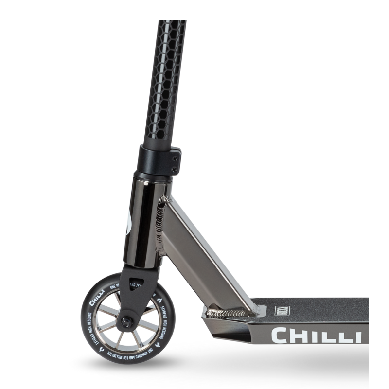 De Chilli Base Rocky black neochrome stuntstep is het perfecte instap model voor kinderen vanaf ongeveer 8 jaar. De Chilli Base Rocky black neochrome stuntstep is opgebouwd uit onderdelen van hoge kwaliteit voor een onverslaanbare prijs. Het 50cm lange en 11,5 cm brede dek ziet er niet alleen heel mooi uit maar zorgt ook voor voldoende ruimte om stevig te staan. Het HIC compression systeem houd het gewicht van de Chilli Base Rocky black neochrome stuntstep laag en zorgt ervoor dat het stuur makkelijk draait voor soepele bar spins. De aluminium core wieltjes van 110mm met ABEC 9 lagers zorgen ervoor dat de Chilli Base Rocky black neochrome stuntstep erg makkelijk over wegen en banen rolt. De totale hoogte van de Chilli Base Rocky black neochrome stuntstep is 82 cm. Chilli heeft met dit model een step voor de beginnende stunter ontwikkeld die geen compromis aan kwaliteit en veiligheid wil doen.