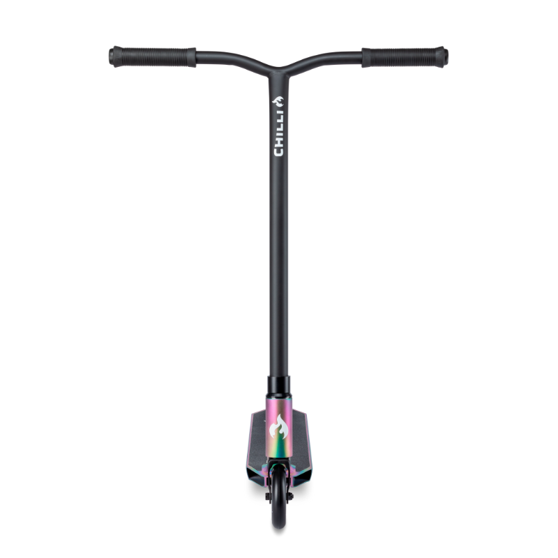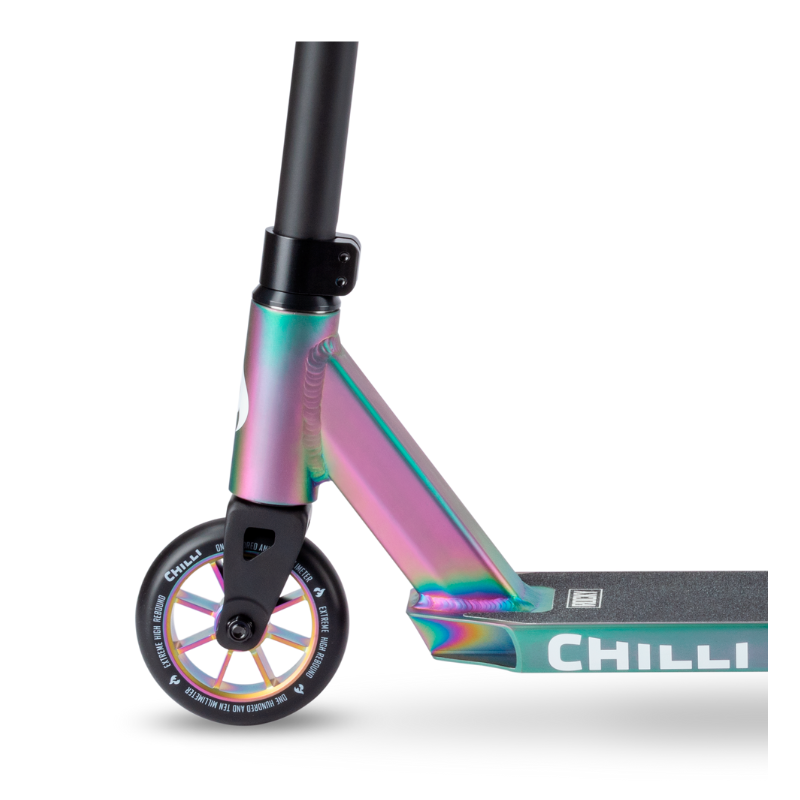 De Chilli Base Rocky matt neochrome stuntstep is het perfecte instap model voor kinderen vanaf ongeveer 8 jaar. De Chilli Base Rocky matt neochrome stuntstep is opgebouwd uit onderdelen van hoge kwaliteit voor een onverslaanbare prijs. Het 50cm lange en 11,5 cm brede dek ziet er niet alleen heel mooi uit maar zorgt ook voor voldoende ruimte om stevig te staan. Het HIC compression systeem houd het gewicht van de Chilli Base Rocky matt neochrome stuntstep laag en zorgt ervoor dat het stuur makkelijk draait voor soepele bar spins. De aluminium core wieltjes van 110mm met ABEC 9 lagers zorgen ervoor dat de Chilli Base Rocky matt neochrome stuntstep erg makkelijk over wegen en banen rolt. De totale hoogte van de Chilli Base Rocky matt neochrome stuntstep is 82 cm. Chilli heeft met dit model een step voor de beginnende stunter ontwikkeld die geen compromis aan kwaliteit en veiligheid wil doen.