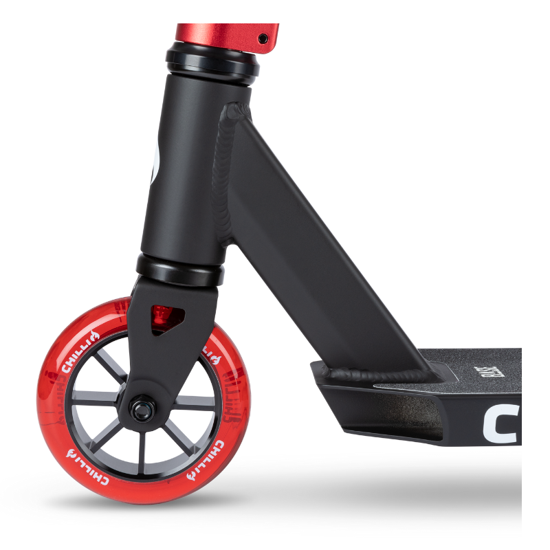 De Chilli Base S black-red stuntstep is het kleine broertje van de Chilli Base. Met het iets kortere deck en de kleinere T-bar is dit het perfecte instap model voor kinderen vanaf ongeveer 6 jaar. Om deze Base S variant nog wat extra te geven zijn de handvatten en wielen doorzichtig. De zeer betaalbare Chilli Base S black-red stuntstep is opgebouwd uit onderdelen van hoge kwaliteit voor een onverslaanbare prijs. Het 47cm lange en 11,5 cm brede dek ziet er niet alleen heel mooi uit maar zorgt ook voor voldoende ruimte om stevig te staan. Het HIC compression systeem houd het gewicht van de Chilli Base S black-red stuntstep laag en zorgt ervoor dat het stuur makkelijk draait voor soepele bar spins. De aluminium core wieltjes van 110mm met ABEC 9 lagers zorgen ervoor dat de Chilli Base S black-red stuntstep erg makkelijk over wegen en banen rolt. De totale hoogte van de Chilli Base S bblack-red stuntstep is 79 cm. Chilli heeft met dit model een betaalbare step voor de beginnende stunter ontwikkeld die geen compromis aan kwaliteit en veiligheid wil doen.